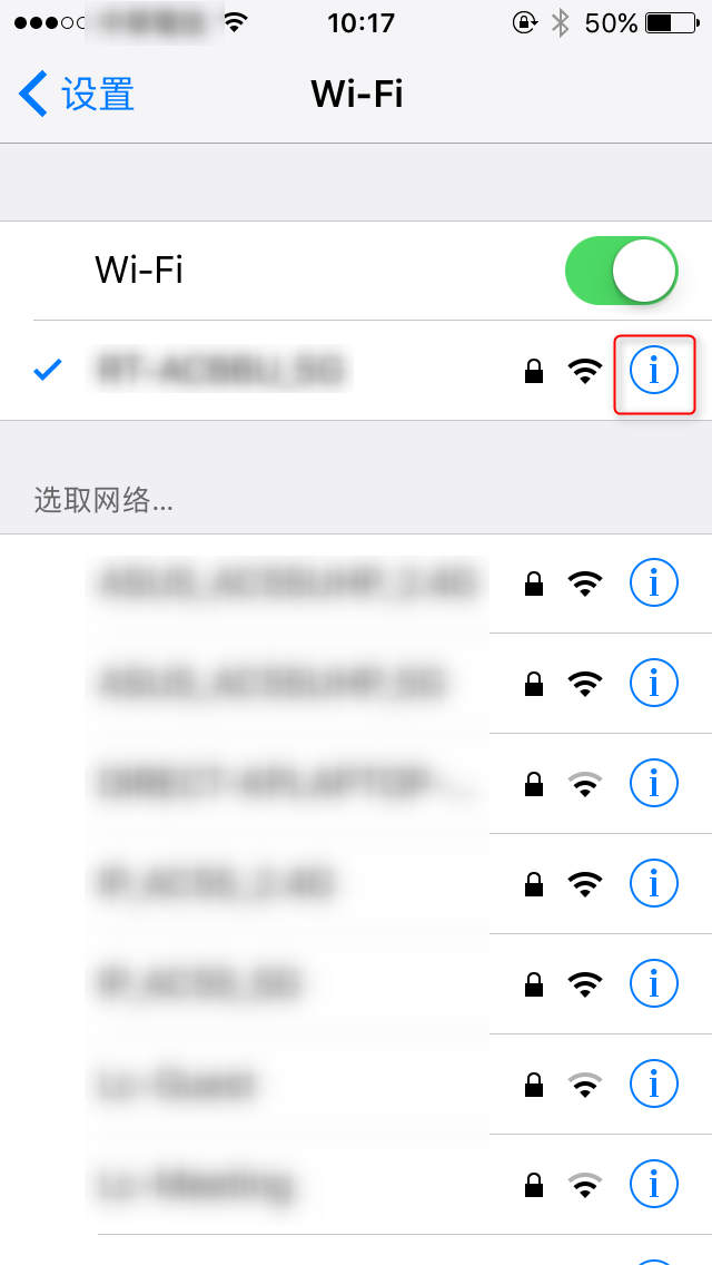 找到您当前已连接的Wi-Fi网络,点击右侧的"信息"图标(ⓘ)进入网络详情。